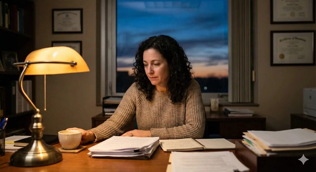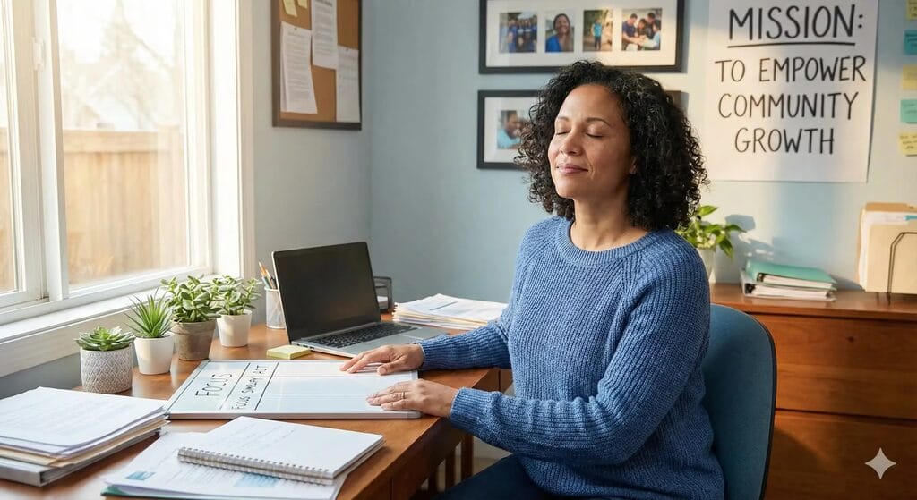 Calm nonprofit leader in organized office practicing sustainable leadership